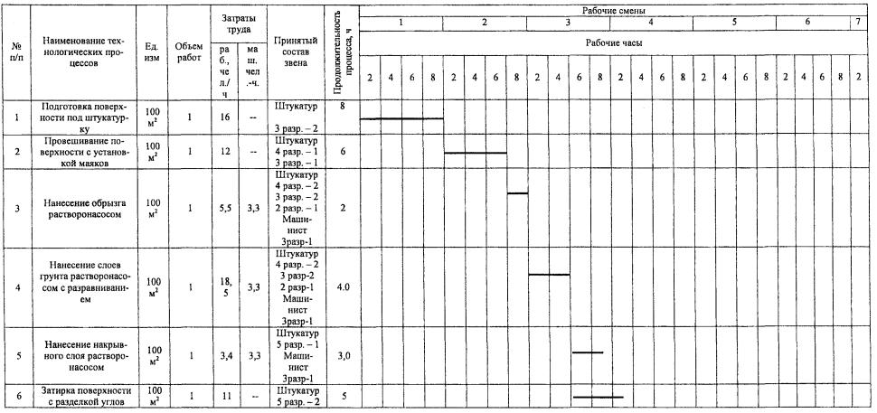 6.3 В качестве единицы измерения для составления калькуляции затрат труда и машинного времени и построения календарного плана производства работ принято выполнение высококачественной штукатурки на 100 м поверхности фасада.