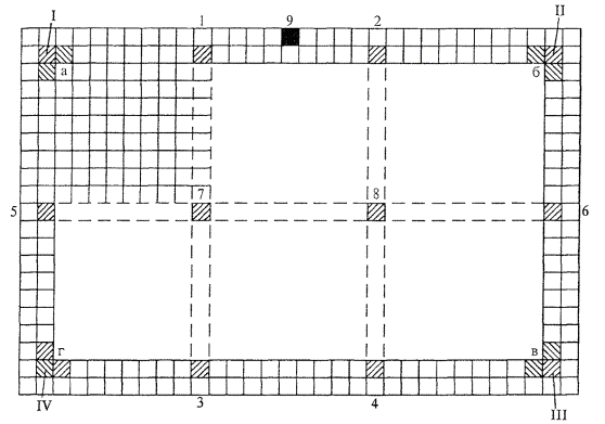2.6 После проверки горизонтальности основания приступают к проверке геометрической формы помещения и разбивке пола: проверяют углы помещения с помощью шнура, который натягивают по диагоналям помещения. Если диагонали одинаковые, следовательно, углы прямые; в этом случае размечают фризы и устанавливают маяки по заданным отметкам чистого пола.