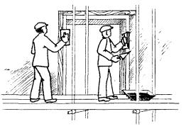 УСТАНОВКА ДЕРЕВЯННЫХ РЕЕК; 7 мин; Ш1 и Ш2; рейки деревянные, молоток, отвес, уровень, правило. Штукатуры Ш1 и Ш2 по отметкам прикрепляют деревянные рейки вокруг оконных и дверных проемов для оштукатуривания откосов и выполнения маячных поясков |