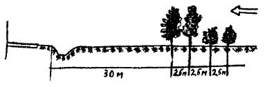 Участки дорог со снегозаносом до 150 м3/п.м надежно защищает система из двух узких древесно-кустарниковых кулис, в которой ближе к дороге располагаемая шестирядная кулиса на расстоянии 40 м от бровки земляного полотна, а со стороны поля четырехрядная кулиса на расстоянии 30 м от шестирядной кулисы (рис. 9).