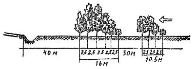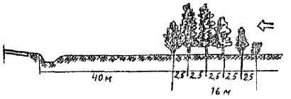Надежной защитой для участков дорог с объемом снегозаноса до 75 м3 п/м служит шестирядная древесно-кустарниковая кулиса, заложенная на расстоянии 40 м от бровки земляного полотна дороги. В такой кулисе кустарники занимают крайние ряды (рис. 7).