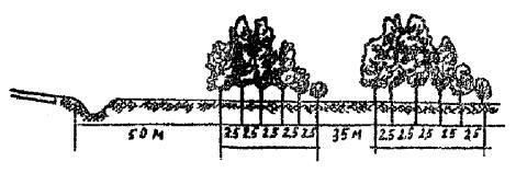 Для участков дорог со снегозаносом до 200 м3/п.м закладывают систему из двух шестирядных древесно-кустарниковых кулис с разрывом между ними в 35 м. При этом ближайшую к дороге кулису размещают на расстоянии не ближе 50 м от бровки земляного полотна (рис. 10).