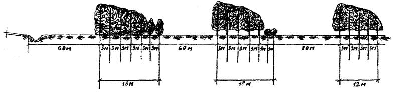 Небольшое количество рядов в кулисах компенсируется загущением посадки в рядах с расстоянием между стволами через 0,4 м и уширением междурядий до 2,5 - 3,0 м, что обеспечивает повышение площади питания растений и возможность механизации обработки почвы и ухода за полосами.