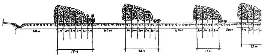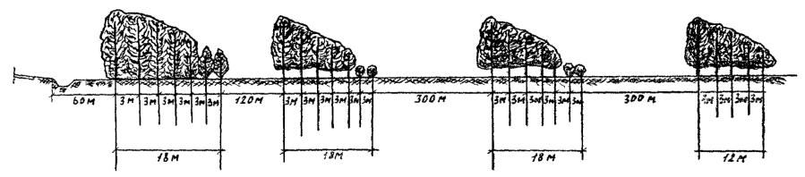 Рис. 9. Размещение древесно-кустарниковых кулис при снегозаносимости до 150 м3/п.м.