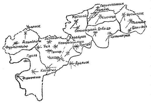 Рис. 14. Схематическая карта северной половины Казахской ССР с розами метелистых ветров.