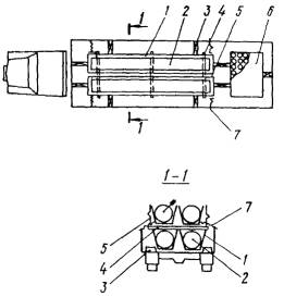1 - контейнер; 2 - сердечник с ковром; 3 - деревянные коротыши; 4 - деревянные брусья; 5 - крепеж контейнеров между собой; 6 - контейнер доборных элементов; 7 - тросовые расчалки