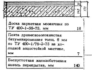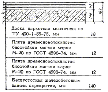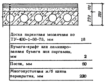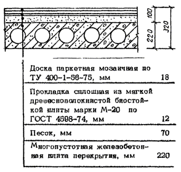 Мозаичные паркетные доски настилают по беспустотным панелям перекрытий по сплошному подстилающему слою из двух слоев древесноволокнистых плит.