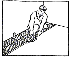 5) настилка первого ряда паркетных досок. Паркетчики натягивают шнур на расстоянии от стены, равному ширине доски плюс 10 - 15 мм. Первую паркетную доску укладывают гребнем к стене и с зазором 10 - 15 мм от нее. Торец доски промазывают при помощи кисти дисперсией ПВА и укладывают вторую доску, соединив торцы в паз и гребень и т.д. вдоль всей стены. Если целая доска не укладывается, паркетчик отмеривает с помощью рулетки нужный размер и распиливает доску на распиловочной машине, причем распиленный торец доски обращает к стене.