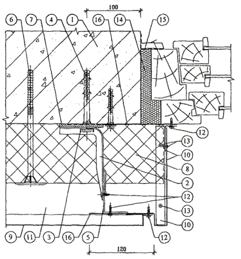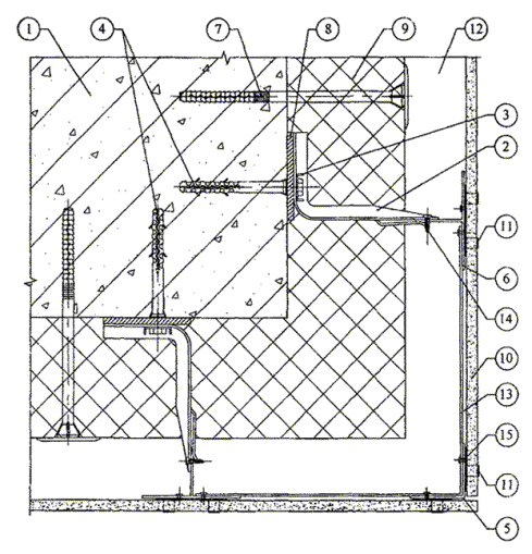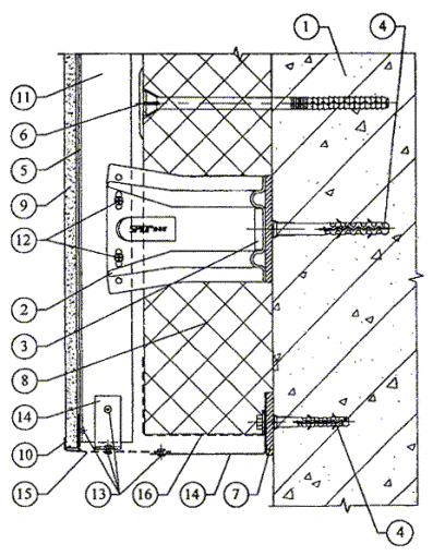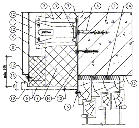 10.5. После разметки фасада в нем сверлятся отверстия под дюбели для крепления кронштейнов к основанию посредством анкерных болтов. Для снижения теплопередачи в месте примыкания кронштейна к основанию между ними на анкерный болт устанавливается паронитовая прокладка.