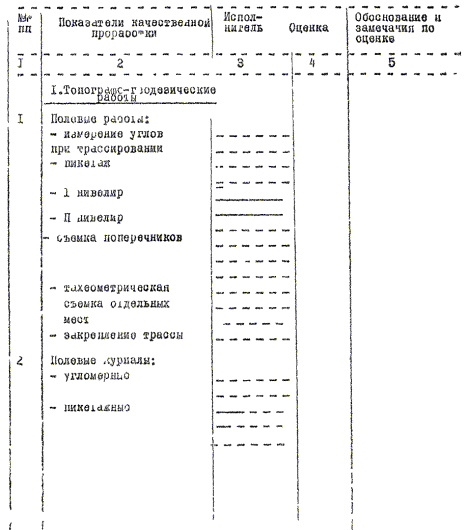 3. Начальник партии дает оценку качества работы каждого исполнителя по топографо-геодезическим, геологическим и камеральным работам, (приложение 11), исходя из «Указаний по оценке качества проектно-изыскательских работ», Союздорпроект 1975 г. Перечень упущений в работе, за которые исполнители лишаются полностью или частично премий приведен в приложении 12.