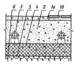 1а - мозаичное или цементно-песчаное покрытие пола; 1б - керамическая плитка; 2 - слой бетона повышенной плотности В-6; 3 - нагревательные элементы (змеевики); 4 - подстилающий слой из конструктивного керамзитобетона; 5 - гидроизоляция; 6 - уплотненный грунт