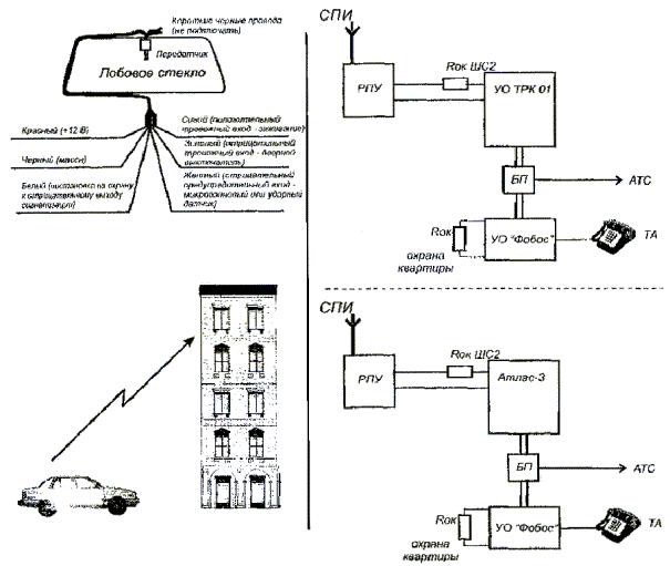 В этом варианте используются два устройства оконечных: один для охраны квартиры, а другой для охраны автомобиля. В качестве оконечного устройства для охраны квартиры здесь используется УО «Фобос», наиболее широко применяемый при охране квартир. Параллельно ему подключается другое объектовое устройство (например: УО «Фобос-ТР-К-01», УО «Фобос-ТР-К-02», УО «Фобос-ТР», УО «Атлас-3», УО «Атлас-6»), предназначенный для охраны автотранспортного средства.