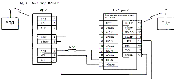 Рис. 10 - Схема подключения АСТС «Reef Page 101RS» к ПУ «Гриф»