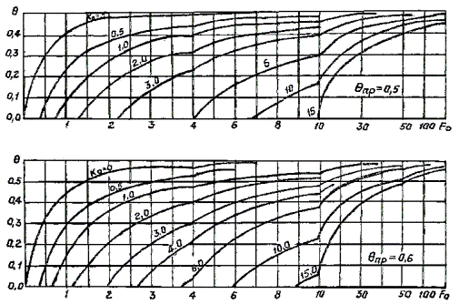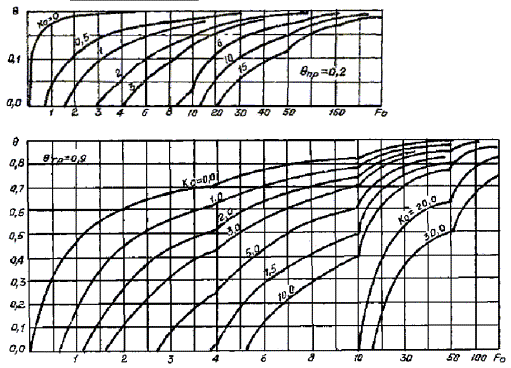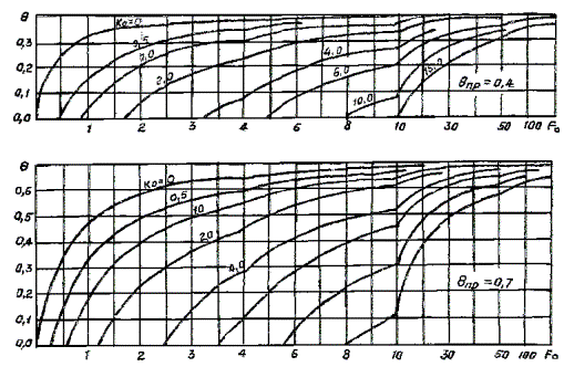 По графику на рис. 9 при К0 = 0, θпр = 0,76 ≈ 0,8 и F0 = 0,3 находим: θ = 0,23.