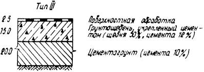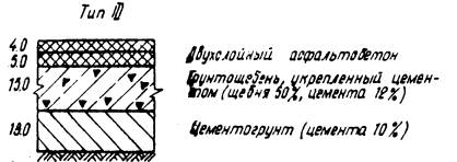 20. Тип II характеризуется применением в качестве несущего слоя дорожной одежды слоя из грунтощебня, укрепленного цементом, а в качестве дополнительного слоя основания - слоя из неукрепленного грунтощебня. Нижний слой дорожной одежды также устроен из уплотненного грунта.