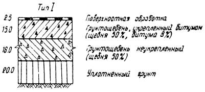 19. Тип I характеризуется применением в качестве несущего слоя дорожной одежды слоя из грунтощебня, укрепленного битумом, а в качестве дополнительного слоя основания - слоя из неукрепленного грунтощебня.
