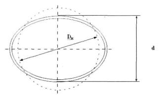 Рис. Б1.1 Схема измерения параметров дефекта "овальность". Фактический центр овальности может быть смещен от центра трубы с номинальным диаметром. |