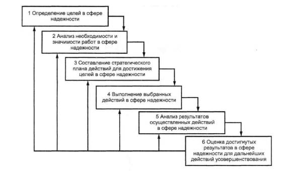 Для управления действиями в сфере надежности организация должна создать систему менеджмента надежности. Система менеджмента надежности организации должна быть неотъемлемой частью ее общей системы менеджмента. Приложение А устанавливает основные этапы менеджмента надежности.