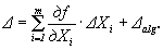 5.3. Характеристики полной (суммарной) погрешности Δ косвенных измерений определяют путем расчета на основе формулы (15) полной погрешности как суммы (объединения) частных погрешностей: взвешенной суммы (объединения) погрешностей Δx, прямых измерений аргументов Xi функции f(Xi .Хm) зависимости измеряемой величины от величин Xi, подвергаемых прямым измерениям; методической погрешности Δalg , обусловленной отличием алгоритма расчета результата косвенного измерения от истинной функции f(Xi .Хm) (п. 5.1.1):