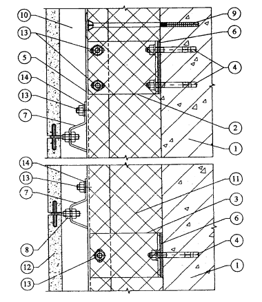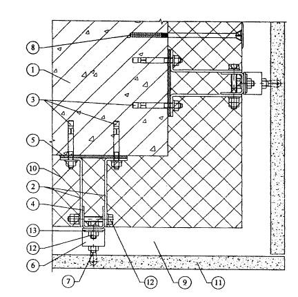 10.8. Крепежные отверстия кронштейнов совмещаются с отверстиями несущих вертикальных профилей. Крепление профиля в кронштейне производится при помощи болтов. Для образования неподвижных (фиксированных) опорных точек болты устанавливаются в круглые отверстия, для подвижных точек - по середине в овальные отверстия. Число фиксированных и подвижных точек определяется статическим расчетом. Оптимально длина вертикальных профилей соответствует высоте одного этажа. В месте стыковки вертикальных профилей по вертикали оставляют температурный зазор 10 мм. К вертикальным профилям крепят Z-образные элементы, в комплект которых входят в регулируемые ручки, имеющие винтовую часть для корректировки положения шпилек. Эти шпильки являются основными точками фиксации для образования облицовочной поверхности здания.