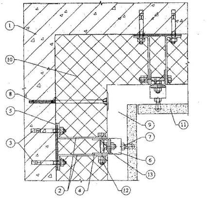 3.3.1. Кронштейны крепят к основанию анкерными дюбелями через парони-товую прокладку, после чего к их свободным концам присоединяют вертикальный профиль и все остальные элементы фасадной облицовки здания.