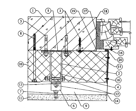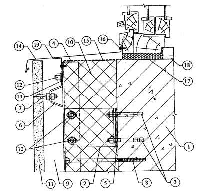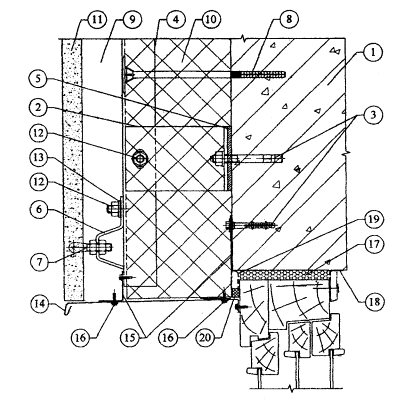 10.5. В соответствии с проектом производится разметка фасада и в нем сверлятся отверстия под дюбели для крепления кронштейнов к основанию посредством анкерных болтов. Для снижения теплопередачи в месте примыкания кронштейна к основанию между ними на анкерный болт устанавливается паронитовая прокладка. Работы по сверлению отверстий осуществляются сразу по всей площади захватки.