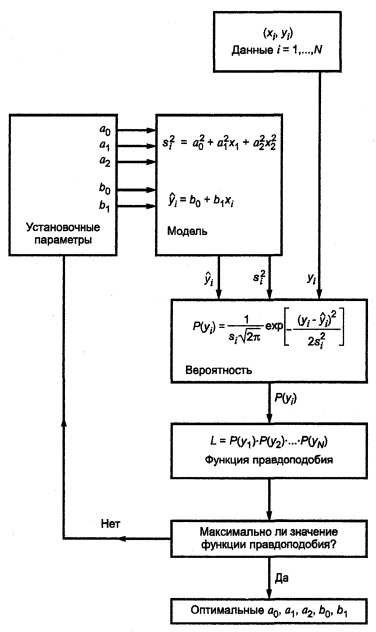 Значения коэффициентов принятой модели дисперсии общего вида [b0 и b1 в формуле (1) и а0, а1 и а2 в формуле (4)] не могут быть рассчитаны. Их подбирают на основе критерия максимального правдоподобия итеративным методом. Блок-схема вычисления коэффициентов функции линейной регрессии методом максимального правдоподобия приведена на рисунке 1. После выбора начальных значений коэффициентов, при использовании допущения о нормальности закона распределения, вычисляют вероятность Р(уi) в каждой точке, отвечающей результатам измерений (хi, yi) и принадлежащей линии регрессии, по формуле