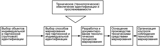 5.1. Комплекс работ по техническому (технологическому) обеспечению идентификаций и прослеживаемости на предприятии включает разработку технологии маркирования применительно к конкретным объектам идентификации, внедрение и поддержание в управляемых условиях технических средств и процессов маркирования. Состав задач технического обеспечения приведен на рисунке 1.
