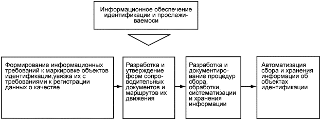 6.1. Информационное обеспечение идентификации и прослеживаемости включает в себя разработку и внедрение информационных форм (сопроводительных документов и других носителей), схем информационных потоков и точек регистрации информации, а также процедур обработки, систематизации, хранения и реализации данных об объектах идентификации, включая машинные способы обработки информации. Состав работ по информационному обеспечению приведен на рисунке 2.