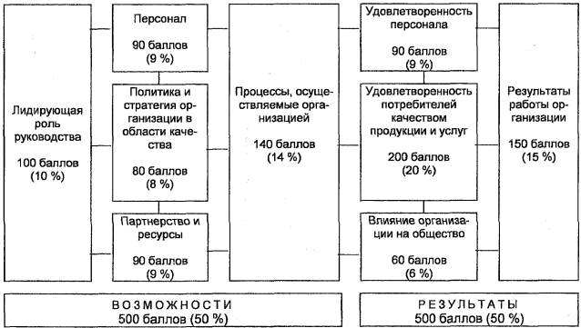 Модель премии приведена на рисунке 1. Каждый критерий имеет свою весомость в общей оценке, выраженную в процентах. Наибольшая суммарная оценка по данной модели в целом составляет 1000 баллов, а наибольшие оценки в баллах по каждому критерию показаны на рисунке 1.