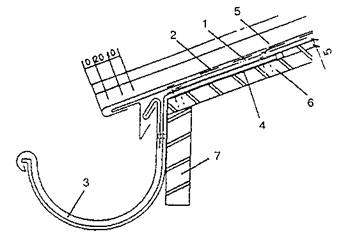 1 - полукруглый желоб; 2 - карнизная планка; 3 - короткий вертикальный свес; 4 - длинный вертикальный свес