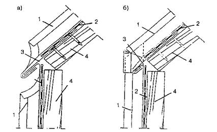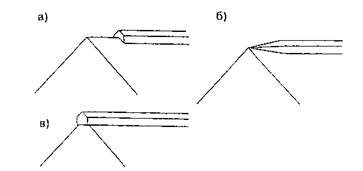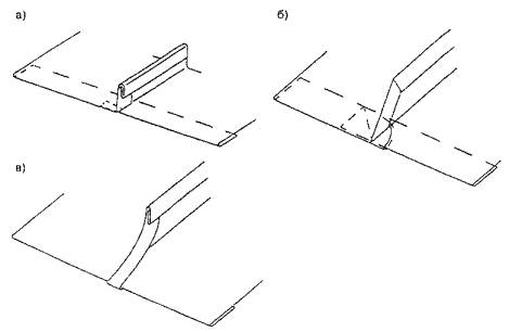а - мягкая пайка или твердая сварка; б - мягкая сварка с одним рядом заклепок; в - мягкая сварка с заклепками, расположенными в шахматном порядке