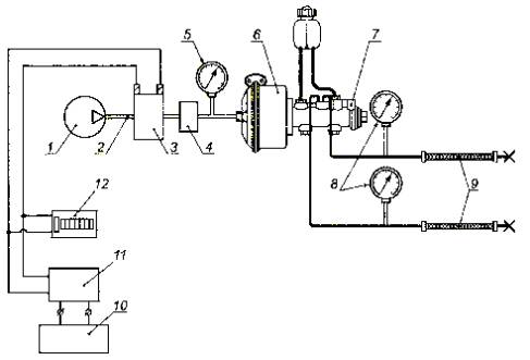 1 - компрессор; 2 - пневматическая магистраль; 3 - электропневмоклапан; 4 - регулятор давления; 5 - манометр; 6 - пневматическая камера; 7 - главный тормозной цилиндр; 8 - гидравлические манометры; 9 - объекты испытаний; 10 - блок питания; 11 - генератор импульсов; 12 - счетчик импульсов