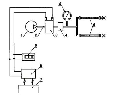 1 - компрессор; 2 - пневматическая магистраль; 3 - электропневмоклапан; 4 - регулятор давления; 5 - манометр; 6 - объекты испытаний; 7 - блок питания; 8 - генератор импульсов; 9 - счетчик импульсов