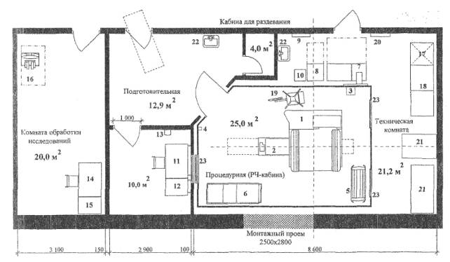 1.4. Все рабочие помещения (кабинеты в которых проводятся исследования) отделения должны располагаться вне зоны воздействия электромагнитных полей, в удалении от рентгенодиагностических кабинетов и кабинетов электросветолечения, в связи с тем, что исследования проводятся с использованием высокочувствительной электронной аппаратуры. При проектировании этих помещений следует учитывать следующие требования: необходимость устранения вибрационных помех, повышенные требования к шумозащите, а также устройство электроэкранов с заземлением.