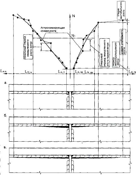 Рис. 3. Диаграмма роста ветвей усталостных трещин в верхней зоне стенки: