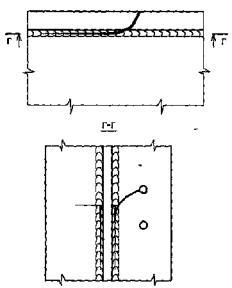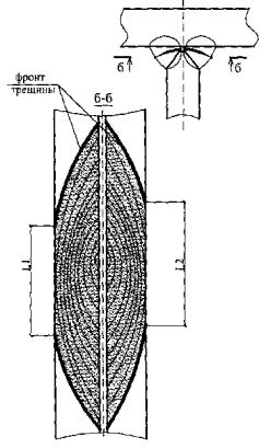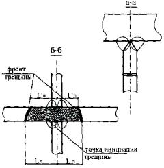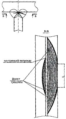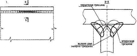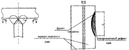 4.1. Поверхностная трещина, развивающаяся в одном валике поясного шва. |