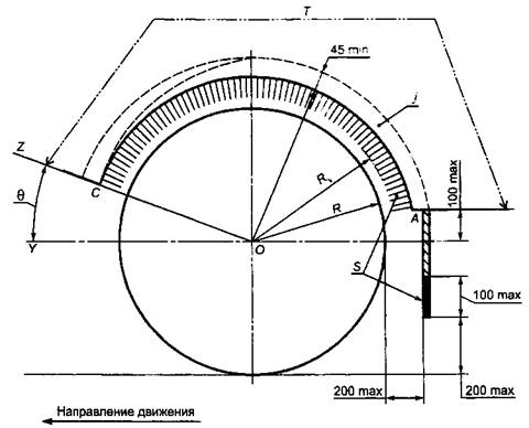 j - наружная боковина; θ - угол между горизонталью О-Y и плоскостью, проходящей через ось колеса О-Z; S - сепаратор «воздух-вода»; Т - протяженность грязезащитного кожуха; R - радиус шины, установленной на ТС; Rv - расстояние по радиусу от оси колеса до наиболее удаленной точки внутренней кромки наружной боковины