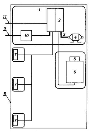 1 - машинное помещение; 2 - основной блок управления/шкаф управления; 3 - выходной порт электропитания; 4 - механизм/двигатель; 5 - устройство управления дверью; 6 - кабина лифта; 7 - аппаратура, установленная на этажах (например, устройства кнопочного управления, индикации); 8 - граница системы; 9 - порты электропитания (переменного и/или постоянного тока); 10 - главный выключатель; 11 - сигнальные порты, порты управления