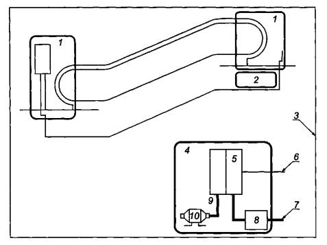1 - панель управления; 2, 4 - машинное помещение; 3 - граница системы; 5 - основной блок управления/шкаф управления; 6 - сигнальные порты, порты управления; 7 - порты электропитания (переменного и/или постоянного тока); 8 - главный выключатель; 9 - выходной порт электропитания; 10 - механизм/двигатель