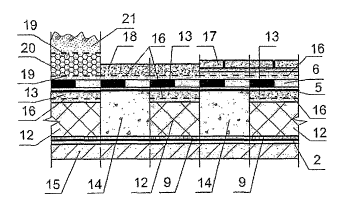 К-3 - традиционная эксплуатируемая 17 - плитка на цементно-песчаном растворе; 18 - защитный слой из цементно-песчаного раствора или асфальтобетона; 19 - предохранительный (фильтрующий) слой из синтетических волокон (геотекстиль); 20 - дренажный слой из гравия; 21 - почвенный слой |