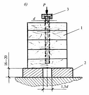 Принцип испытаний основан на приложении усилия к единичному клеевому соединению при продольном сжатии (параллельно волокнам древесины).