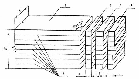 1 - заготовка для выпиливания образцов для испытаний на скалывание по ГОСТ 15613.1; 2 - пропилы при выпиливании заготовок; 3 - торцы образцов (перед вымачиванием покрыть эпоксидной шпатлевкой ЭП-001); 4 - образец для испытаний на скалывание по ГОСТ 15613.1