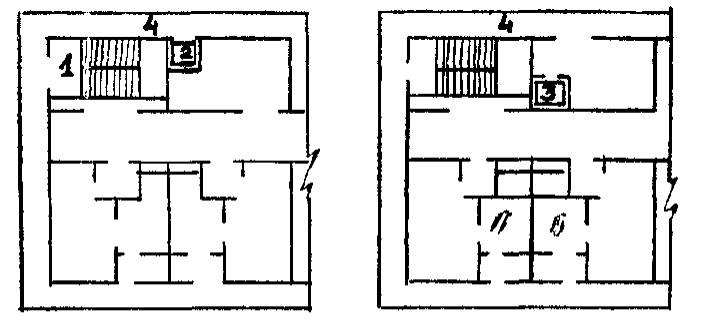 Рис. 3. "Схемы размещения встроенных в здание лестницы и лифта, имеющих вход только с поэтажных галерей" 1, 2 – лестница и лифт, не сообщающиеся с внутренними помещениями отделений; 3 – лифт, открывающийся в помещение с выходом только на галерею многоэтажного корпуса; 4 - галерея