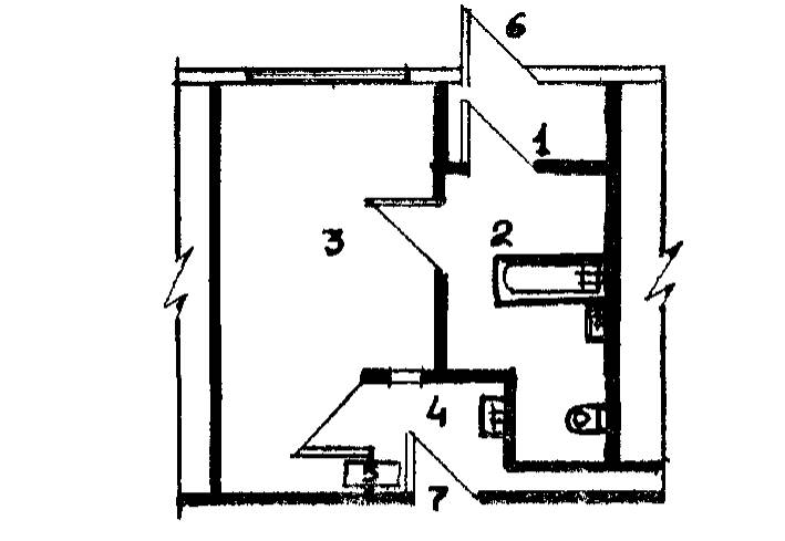 Рис. 4. "План бокса" 1 тамбур; 2 – санитарный узел; 3 – палата; 4 – шлюз; 5- шкаф для передачи пищи и медикаментов; 6 – вход с улицы; 7 – вход из коридора
