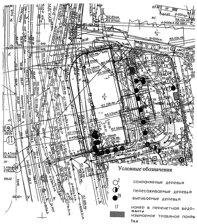 Сохраняемые деревья обозначаются незакрашенным кружочком, вырубаемые деревья - полностью закрашенным кружочком, пересаживаемые деревья - наполовину закрашенным.