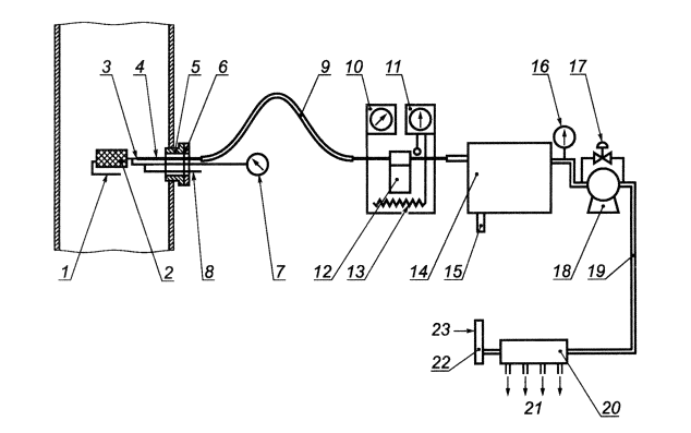 1 - отклоняющая пластина; 2 - фильтр грубой очистки; 3 - держатель; 4 - зонд; 5 - штуцер; 6 - крышка; 7 - манометр; 8 - трубка для подачи нулевого и калибровочного газов; 9 - обогреваемая трубка для отбора проб; 10 - датчик температуры (температура трубки для отбора проб); 11 - датчик температуры (температура нагревателя); 12 - фильтр тонкой очистки; 13 - нагреватель; 14 - охладитель; 15 - трубка для слива конденсата; 16 - вакуумметр; 17 - перепускной клапан; 18 - насос; 19 - трубка для отбора проб (нагревание необязательно); 20 - коллектор; 21 - трубки для подачи газа к газоанализаторам; 22 - расходомер; 23 - трубка для сброса избытка газа