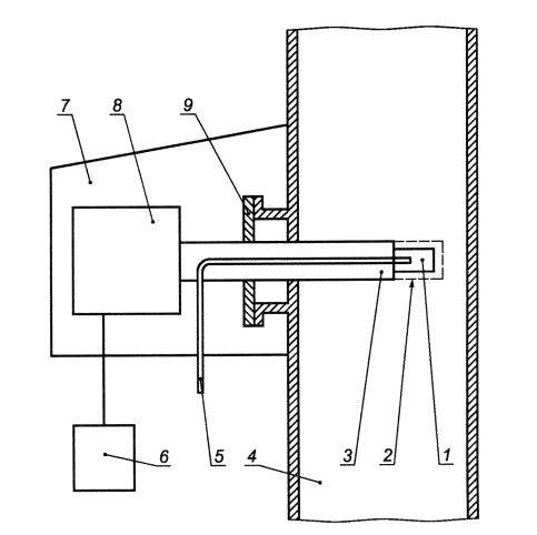 1 - измерительная ячейка; 2 - фильтр для защиты измерительной ячейки; 3 - зонд; 4 - газоход или труба; 5 - трубка для подачи калибровочного газа; 6 - блок регистрации данных; 7 - защитный кожух; 8 - приемопередающий блок; 9 - крепление зонда