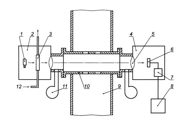1 - источник излучения; 2 - излучатель; 3 - внутренняя калибровочная ячейка; 4 - приемник; 5 - защитное окно; 6 - детектор; 7 - электронный модуль; 8 - блок регистрации данных; 9 - газоход или труба; 10 - труба для настройки или калибровки; 11 - нагнетатель продувочного воздуха; 12 - трубка для подачи калибровочного газа
