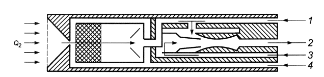 1 - область пониженного давления зонда; Q2 - расход разбавляемого газа/ пробы (Q2); 2 - расход разбавленной пробы (Q1 + Q2); 3 - расход газа-разбавителя/воздуха (Q1); 4 - продувка калибровочным газом/воздухом